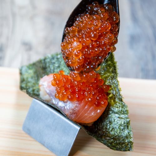 零れすぎ!?こぼれいくら寿司●こぼれるいくらは、一粒一粒がキラキラと光っています!お酒にもピッタリですので是非、ご賞味ください。